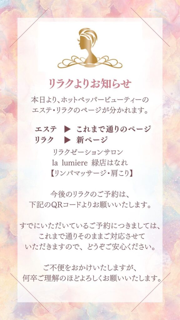 今回のリニューアルにより、エステメニュー・リラクメニューがより見やすく、選びやすくなりました。新しいページへの移行に際し、お手数をおかけいたしますがブックマークのご登録などご協力いただけますと幸いです。