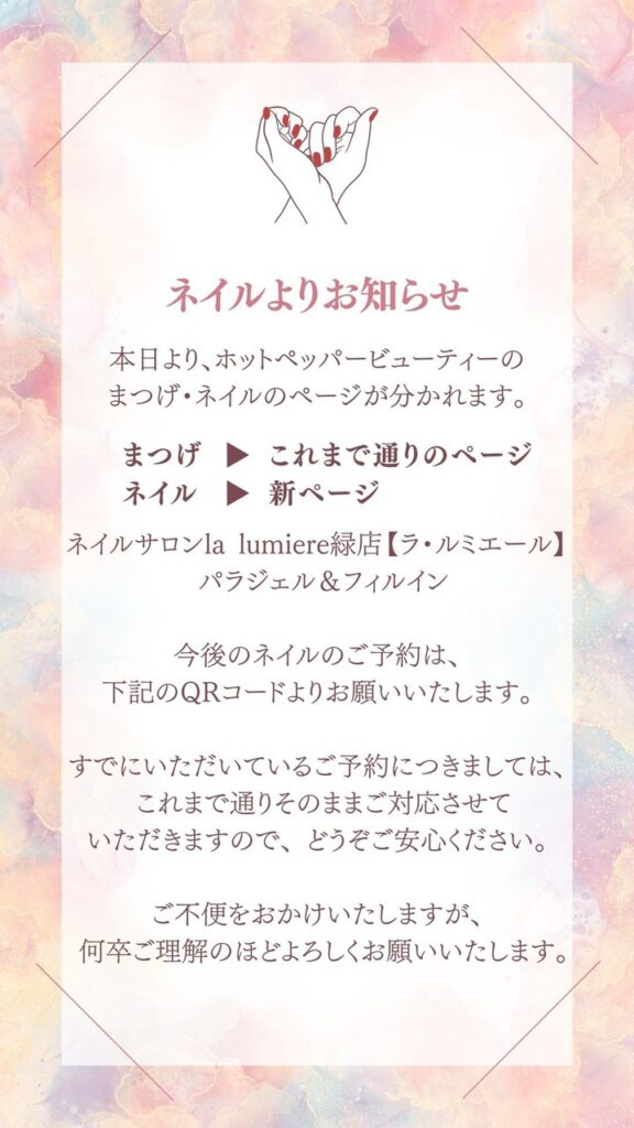 今回のリニューアルにより、アイメニュー・アイブロウメニュー・ネイルメニューがより見やすく、選びやすくなりました。新しいページへの移行に際し、お手数をおかけいたしますがブックマークのご登録などご協力いただけますと幸いです。