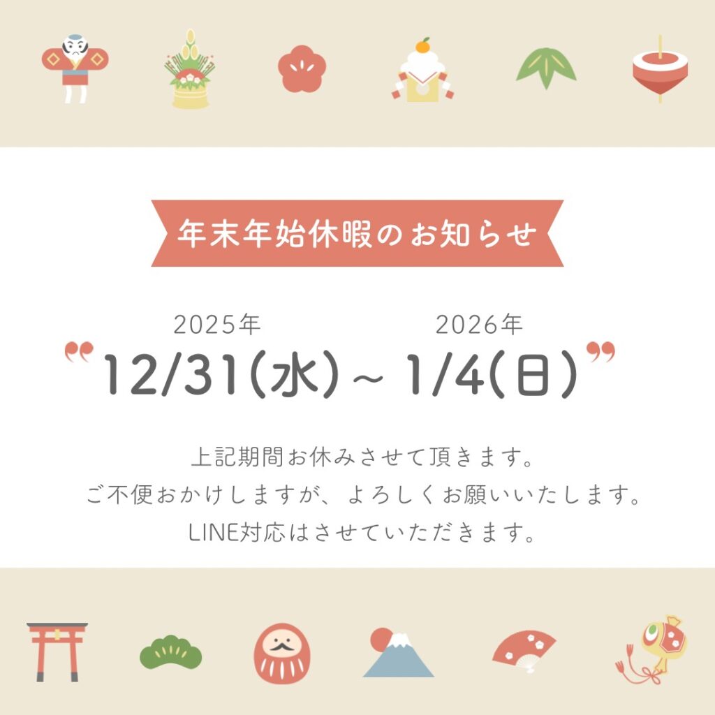 年末年始休暇のお知らせ(期間:2025年12月31日〜2026年1月4日) 2025年11月1日 Filed under: 新着情報 誠に勝手ながら、2025年12月31日(水)〜2026年1月4日(日)までの5日間、年末年始休暇とさせていただきます。 期間中はご不便をおかけいたしますが、何卒ご理解のほどよろしくお願い申し上げます。