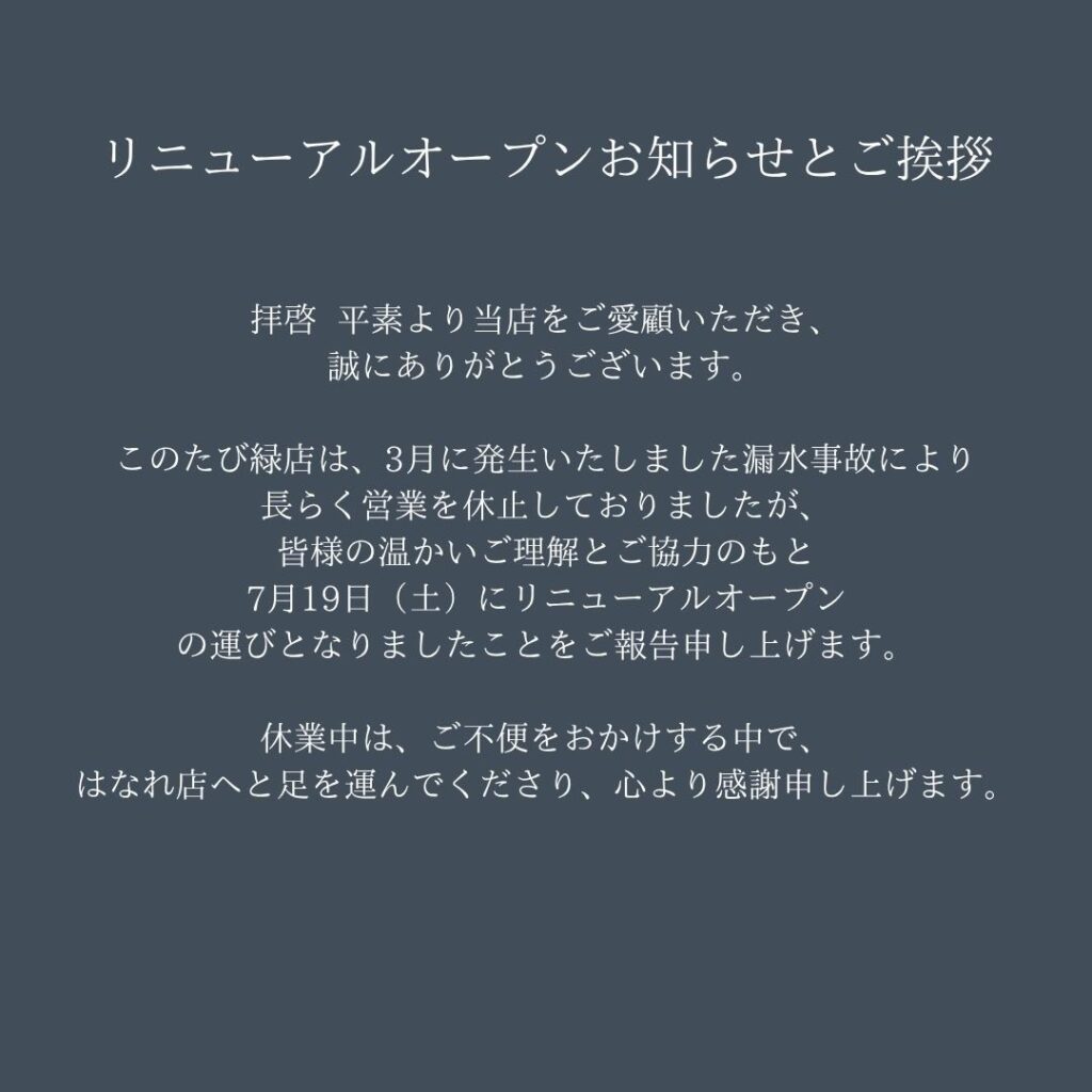 このたび緑店は、3月に発生いたしました漏水事故により長らく営業を休止しておりましたが、皆様の温かいご理解とご協力のもと