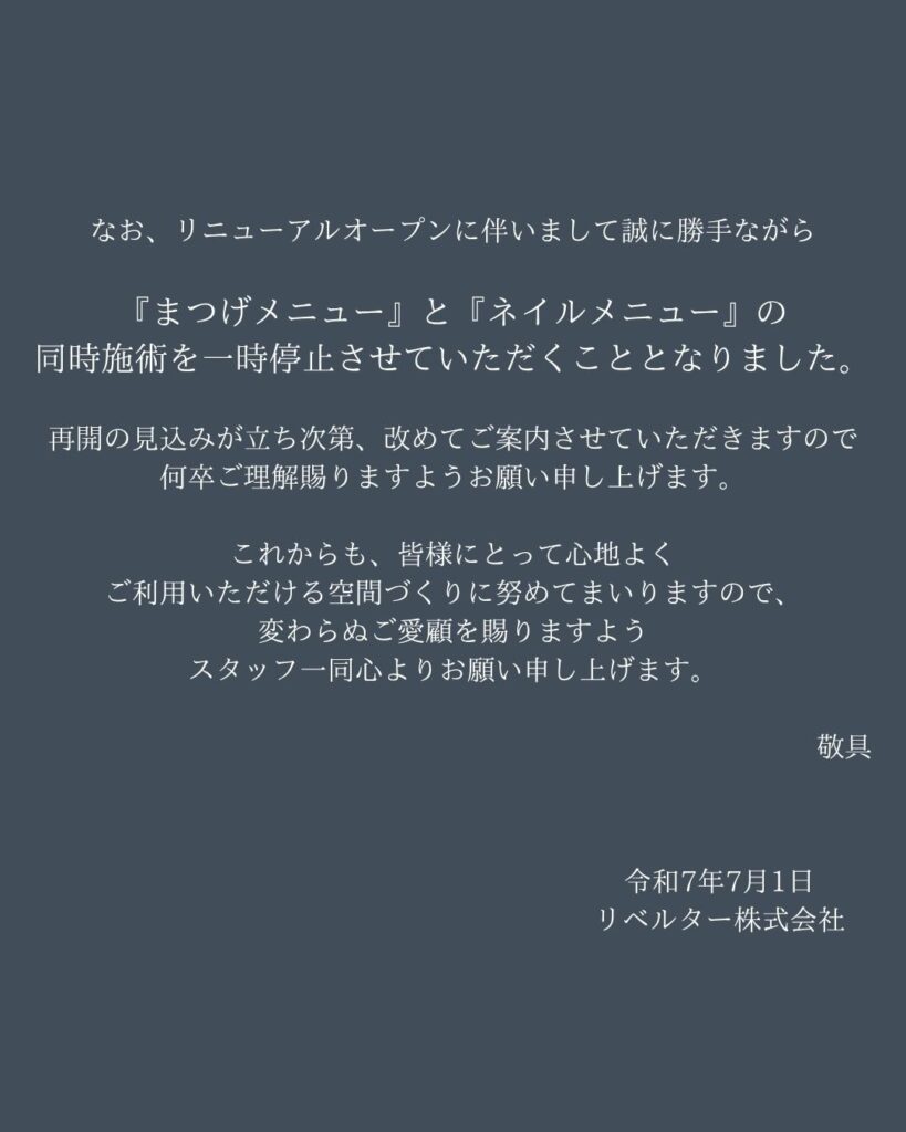 『まつげメニュー』と『ネイルメニュー」の同時施術を一時停止させていただくこととなりました。